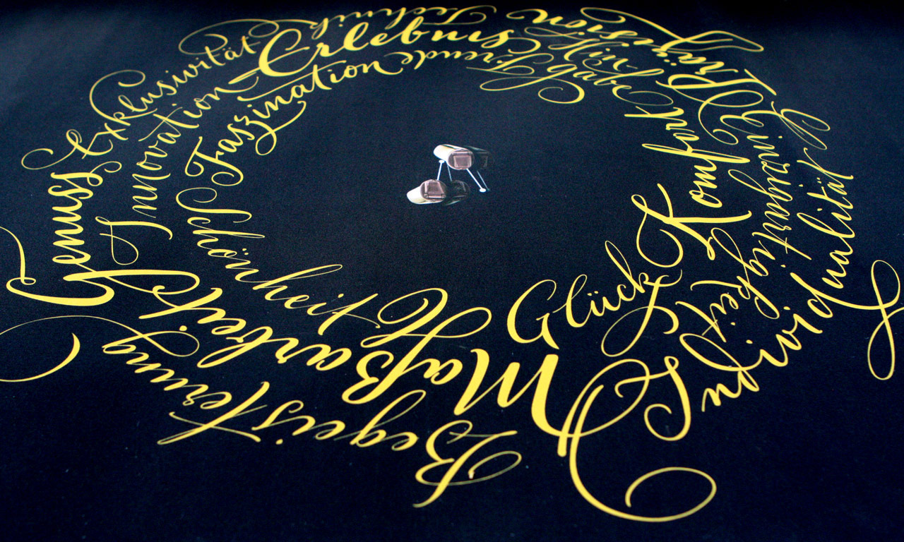 Leistung: Schriftentwürfe und Umsetzung des kalligrafischen Bildelements aus Worten.Lieferung der Feindaten für den Druck.